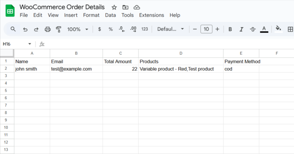 You can perform a test submission by creating a new WooCommerce order and checking inside the Google Sheet.
