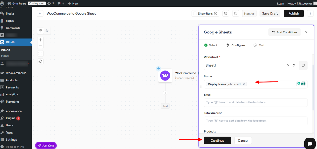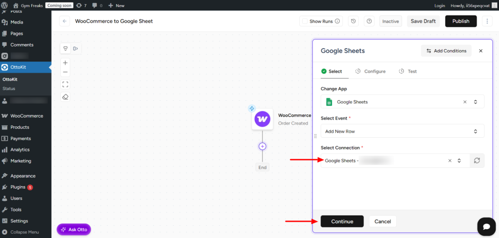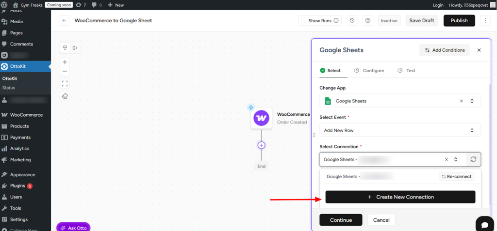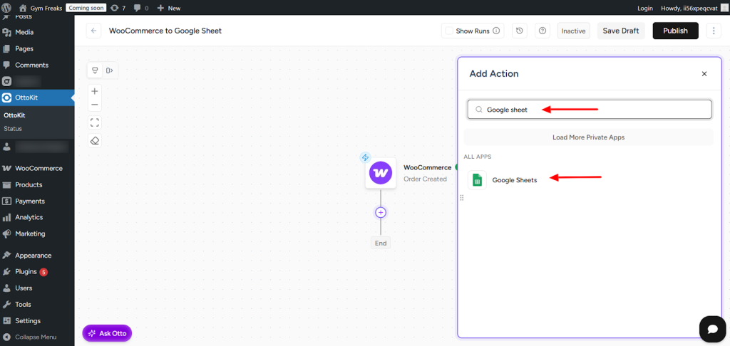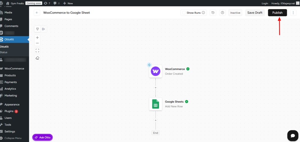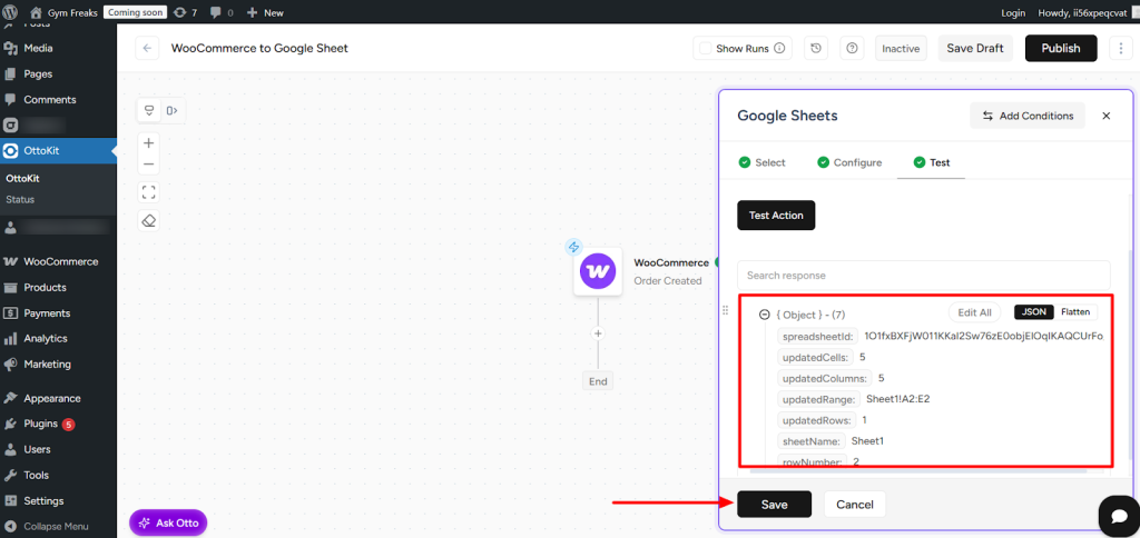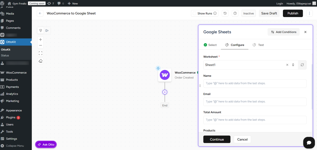 With OttoKit, you can create a workflow that automatically adds a new row to Google Sheets whenever a WooCommerce order is created.