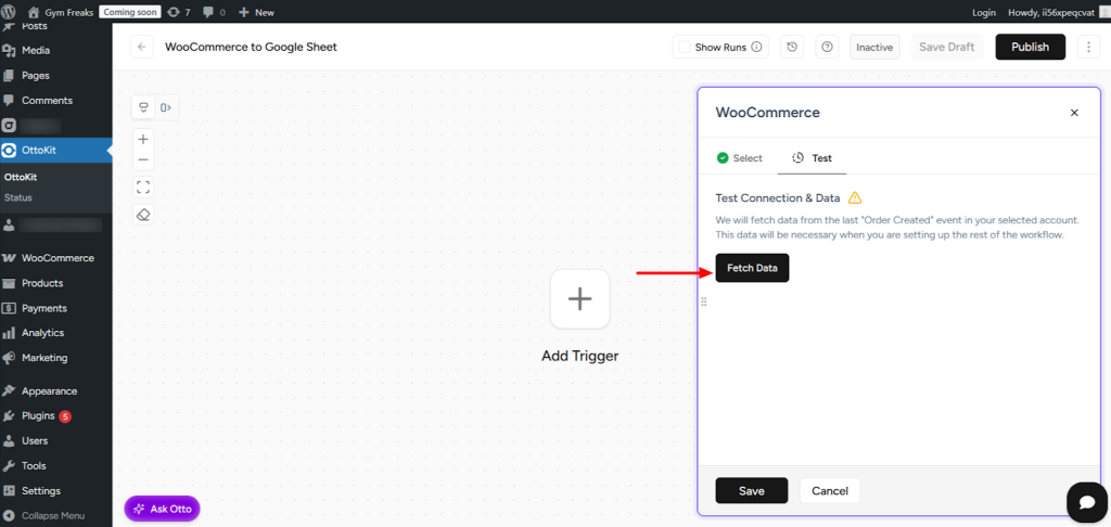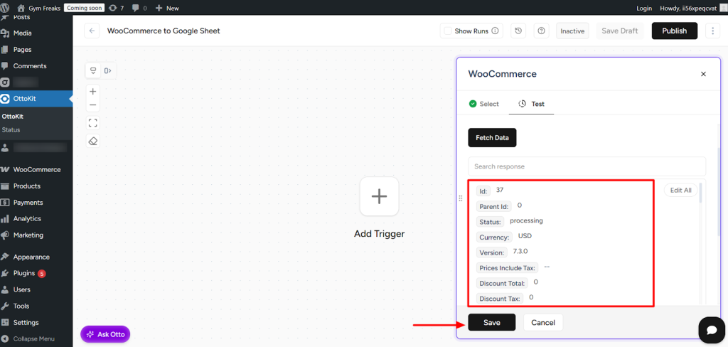 1. OttoKit will automatically fetch recent order data from your WooCommerce store (no test order is required). Once the data is fetched, click Save.