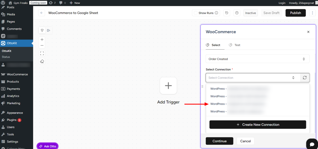 1. Click on Select Connection, then choose the WordPress site you want to connect from the dropdown and click Continue.