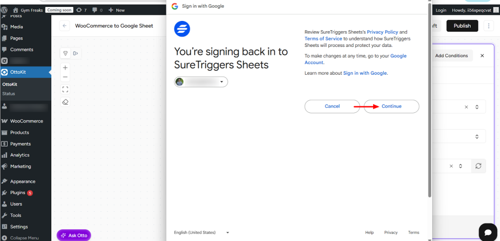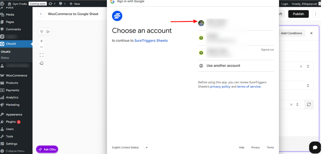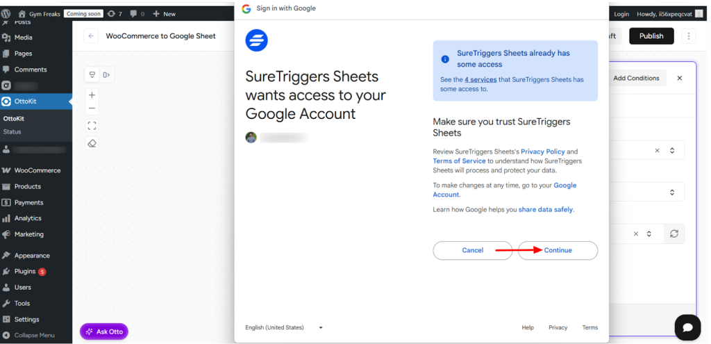 1. A popup will appear asking you to select the email address to connect Google Sheets. Choose the appropriate email and continue.