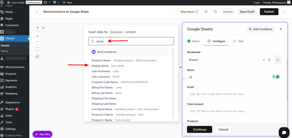 1. In the Name field, type @. Do the same for the other fields. A popup will appear showing dynamic fields from the WooCommerce response.