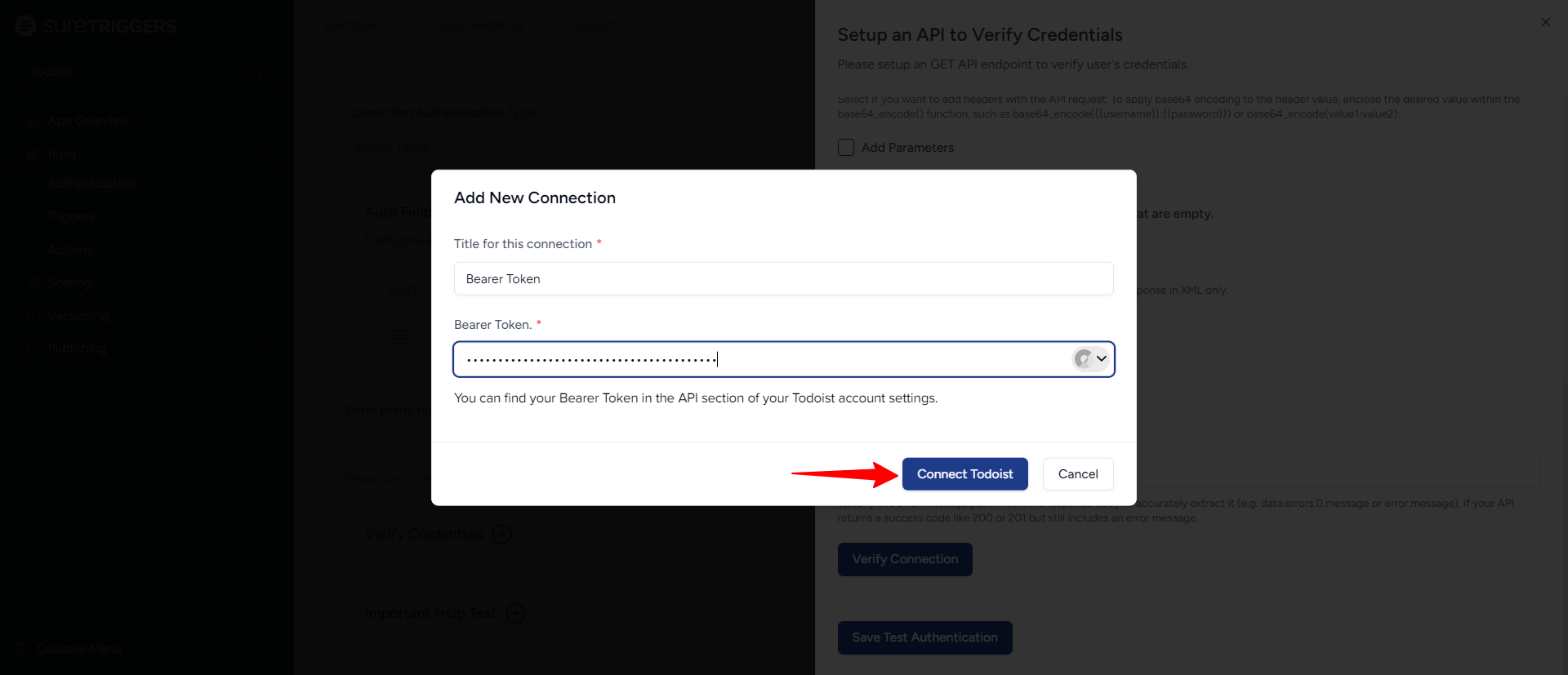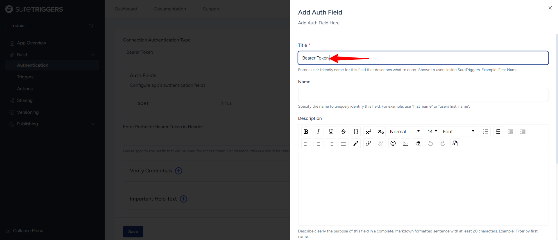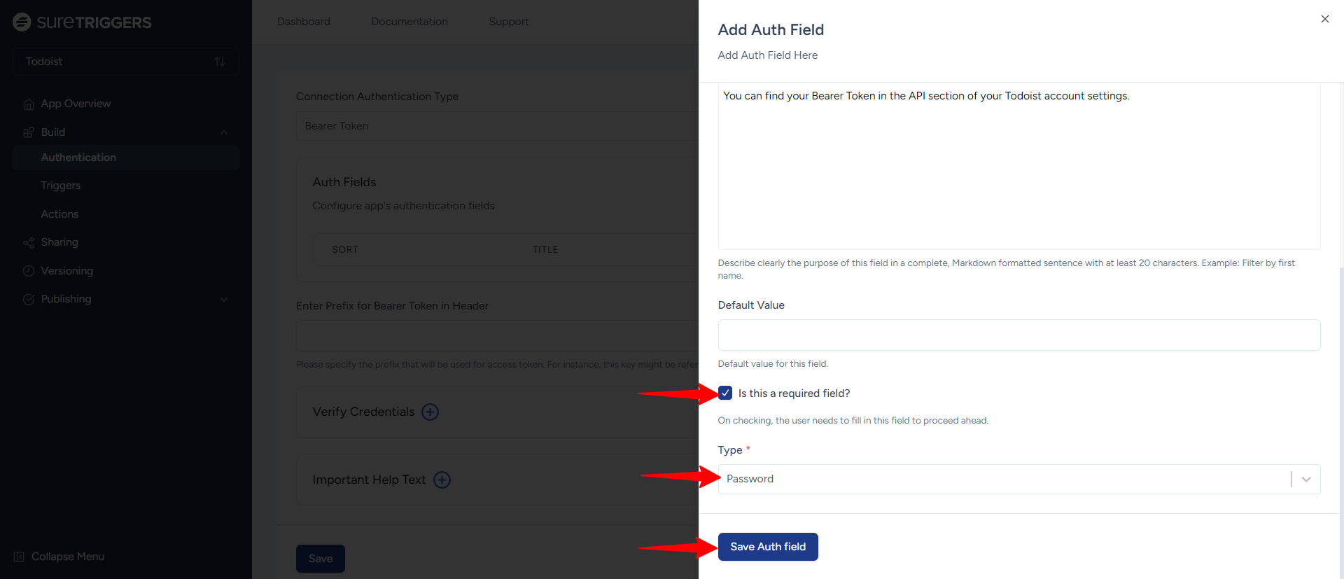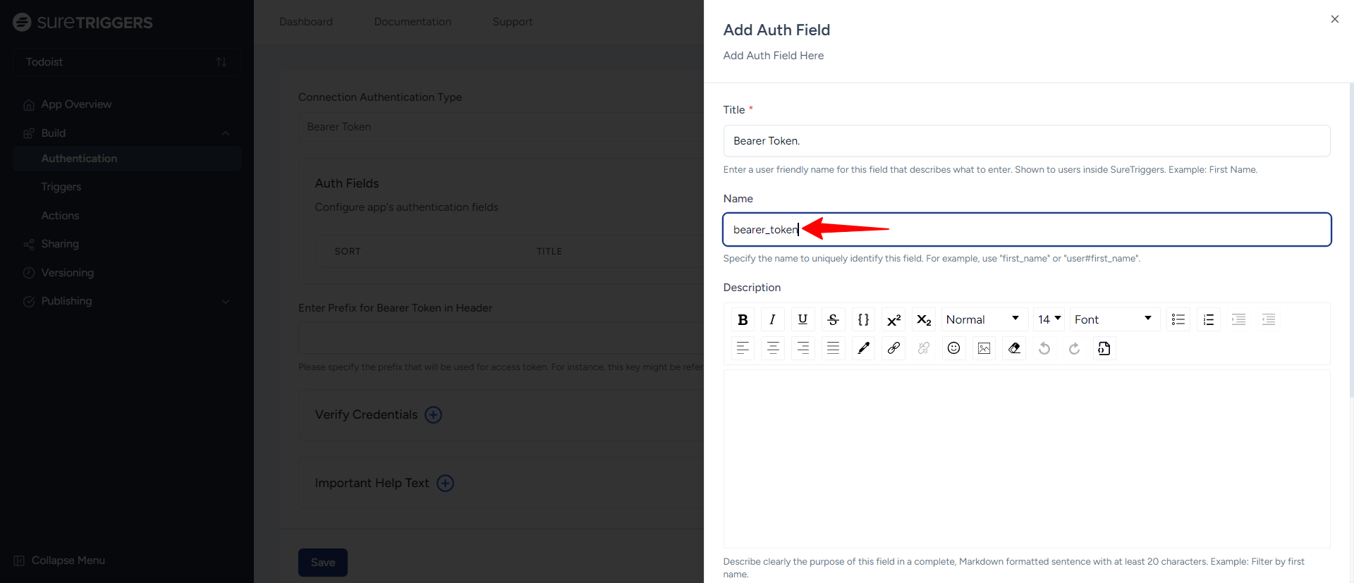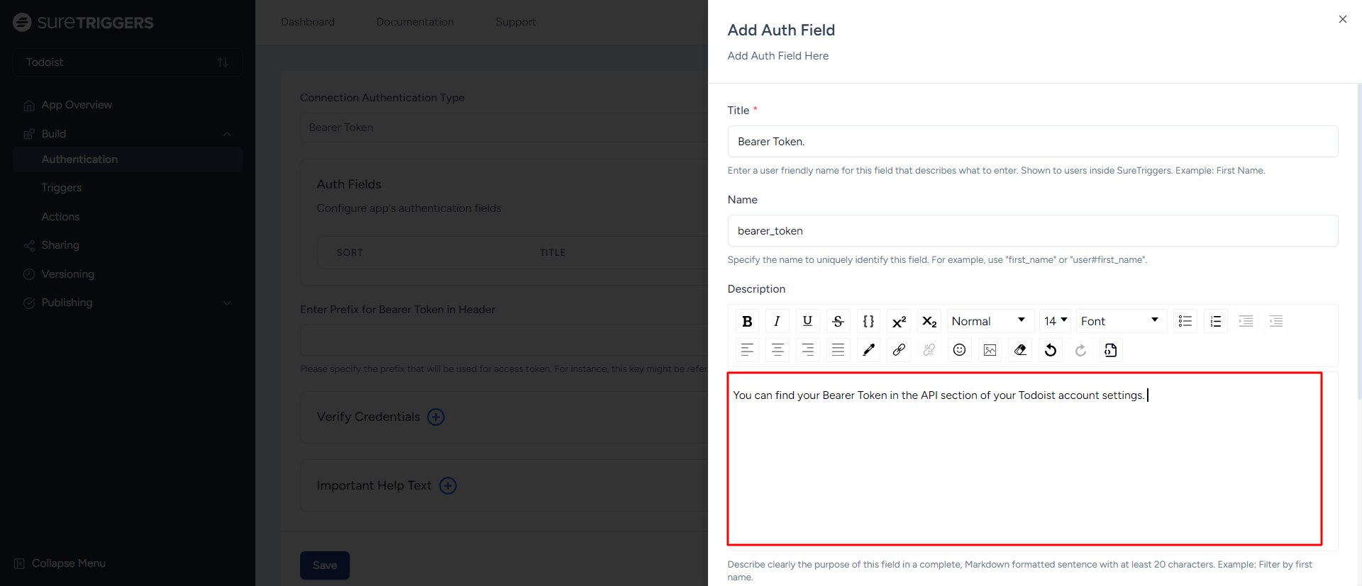 - Add a Description that explains where users can find their Bearer Token in their Todoist account, such as: “You can find your Bearer Token in the API section of your Todoist account settings.”