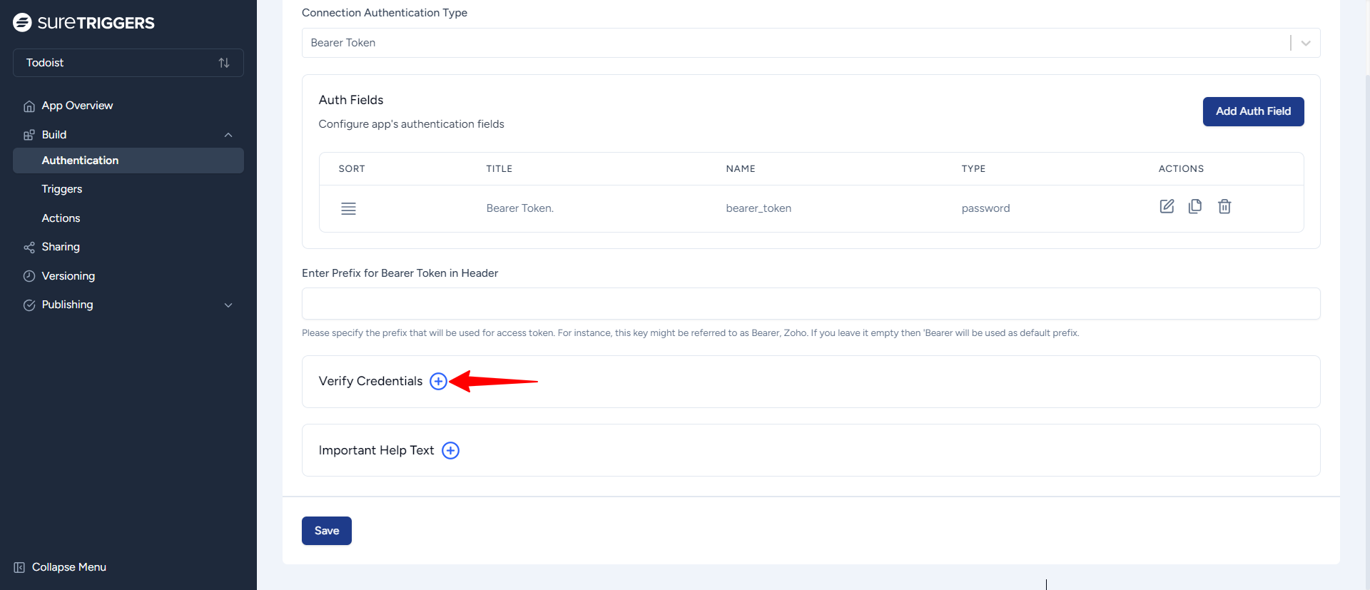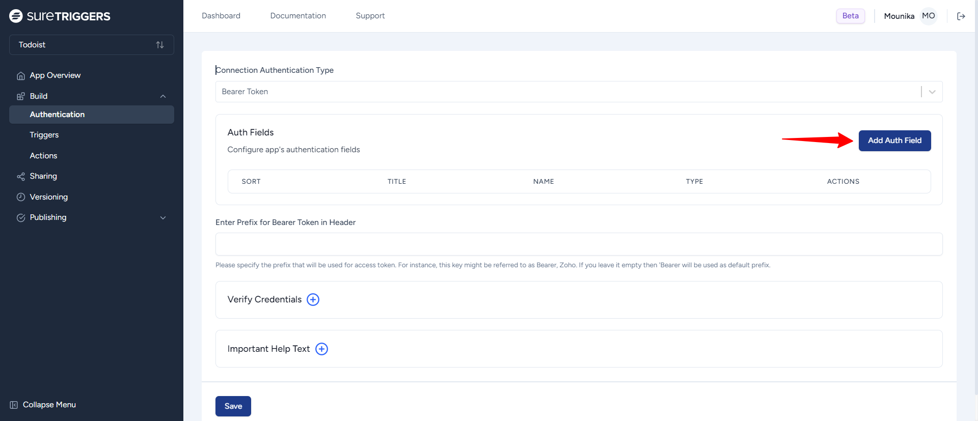 - Give the field a user-friendly name, such as “Bearer Token.” This is what users will see when they connect Todoist to OttoKit.
