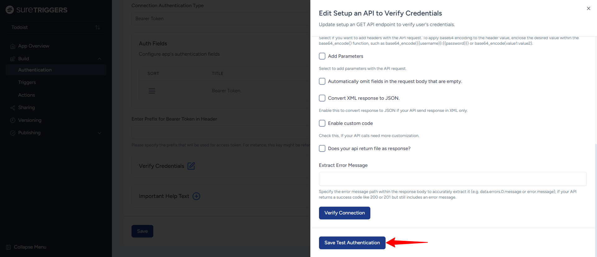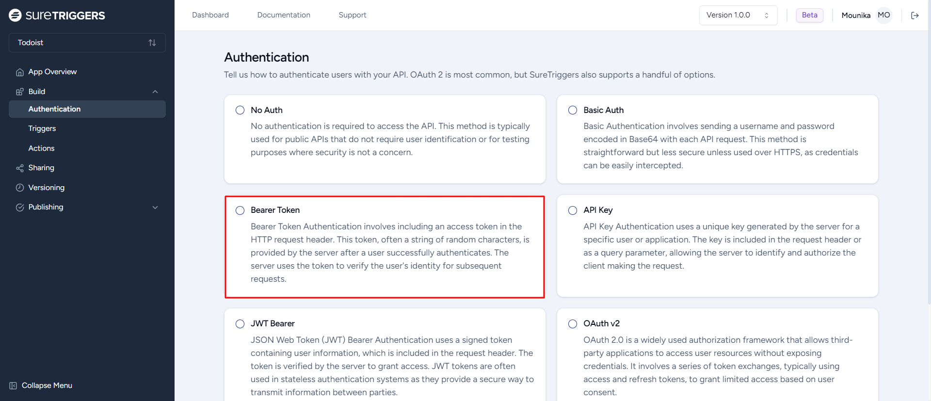 - On the Authentication page, select “Bearer Token”. We followed the Todoist API documentation for selecting the authentication type as the Bearer Token.