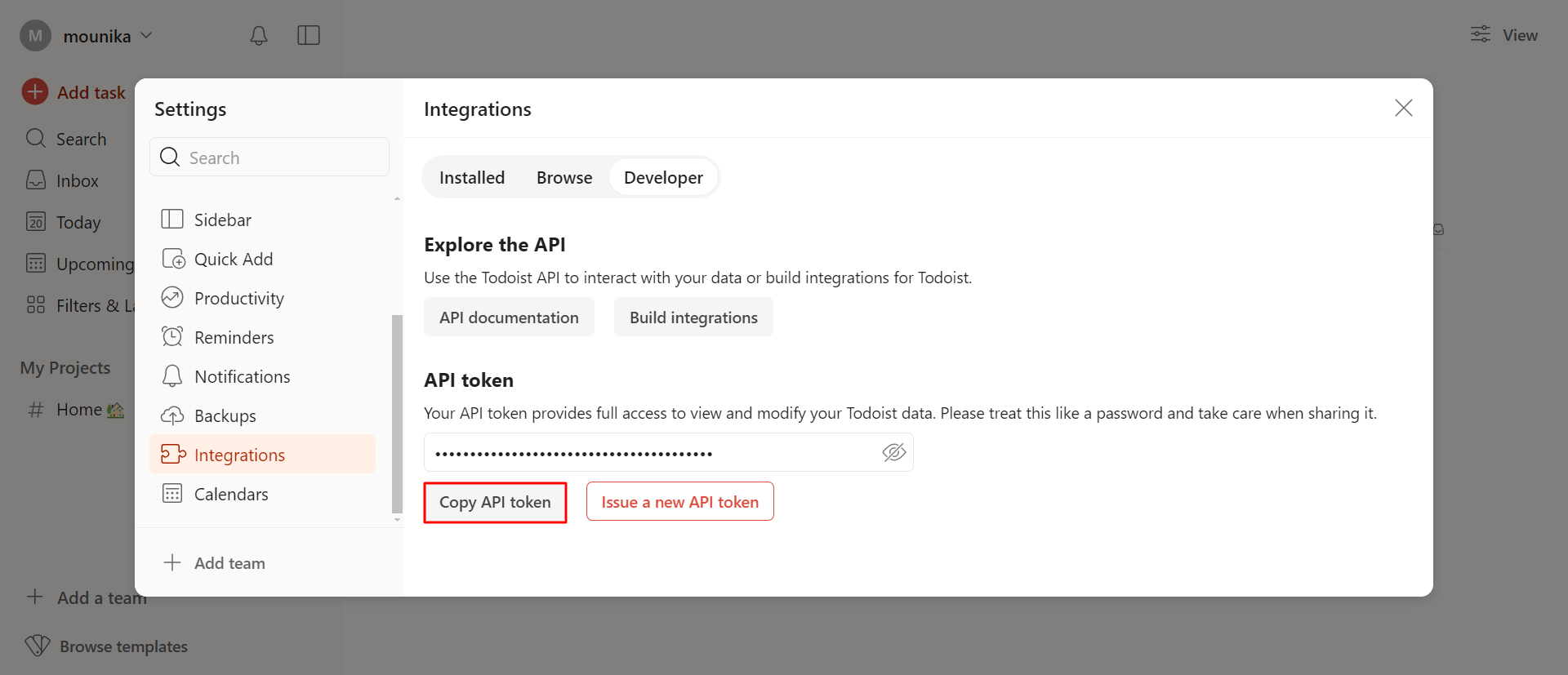 Make sure you keep this token secure, as it grants access to your Todoist account for automations.