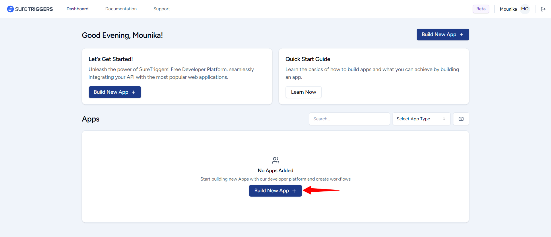 - Then, click on the Build New App button. Fill in all the details of your app in the flyout, and then click on the “Create” button to create the app. Check out this article to learn more about this.