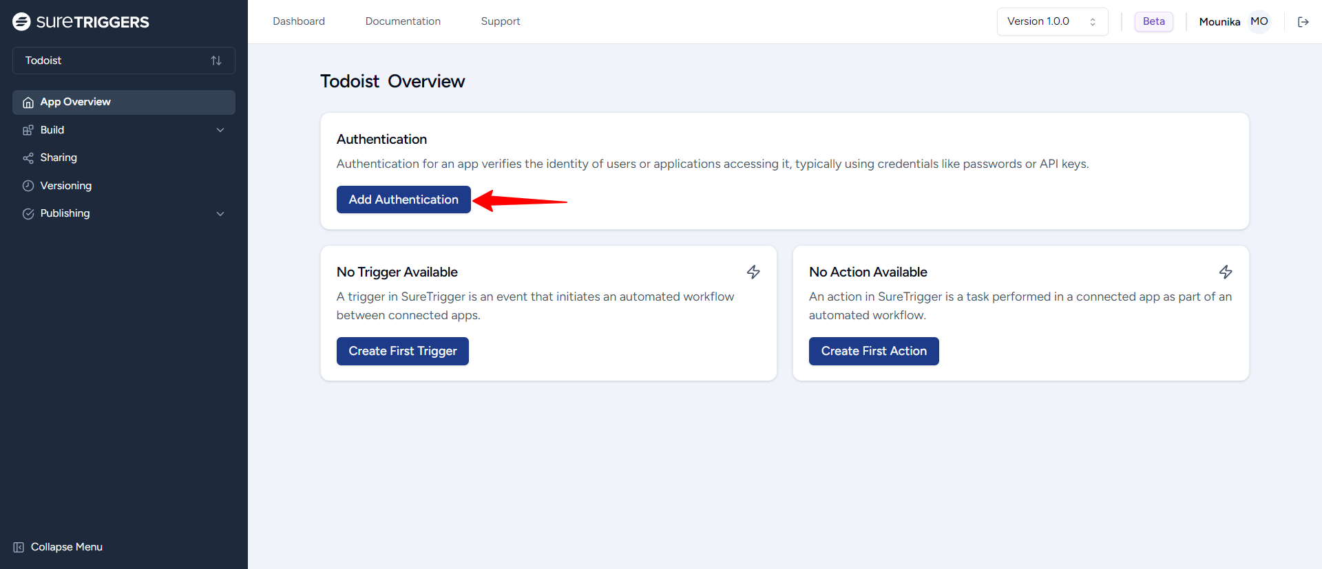 - You’ll be automatically redirected to the “App Overview” page. Here, click the Add Authentication button to proceed.