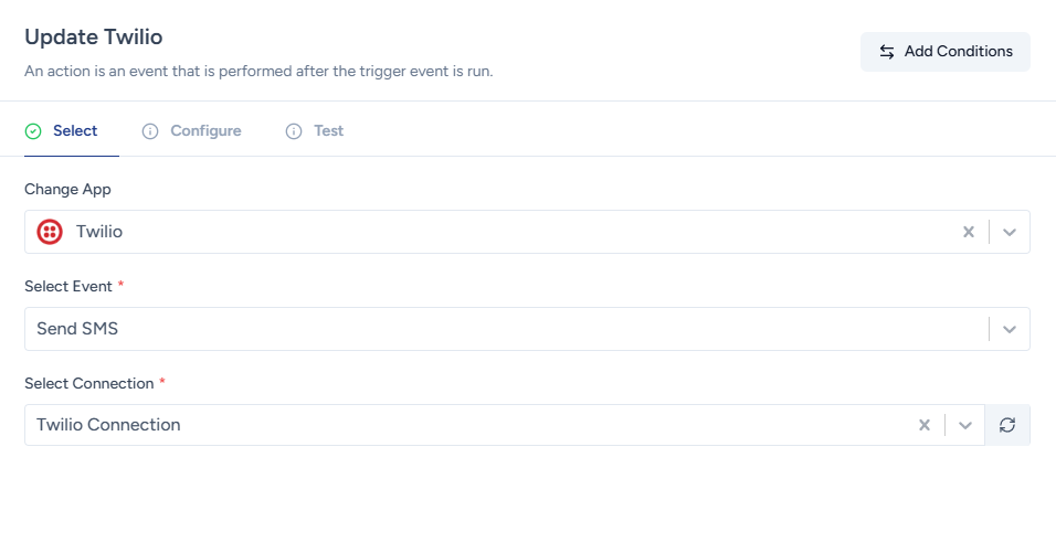 Continuing the above example, to automate the process of sending an SMS when a customer purchases a product from your WooCommerce store, you can select the action as ‘Send SMS’ in the Twilio app.