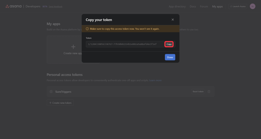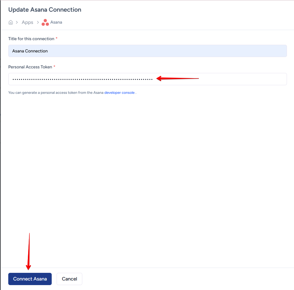 1. Return to the OttoKit connection flyout and paste the token into the Personal Access Token field. Once done, click the “Connect Asana” button at the bottom of the flyout.