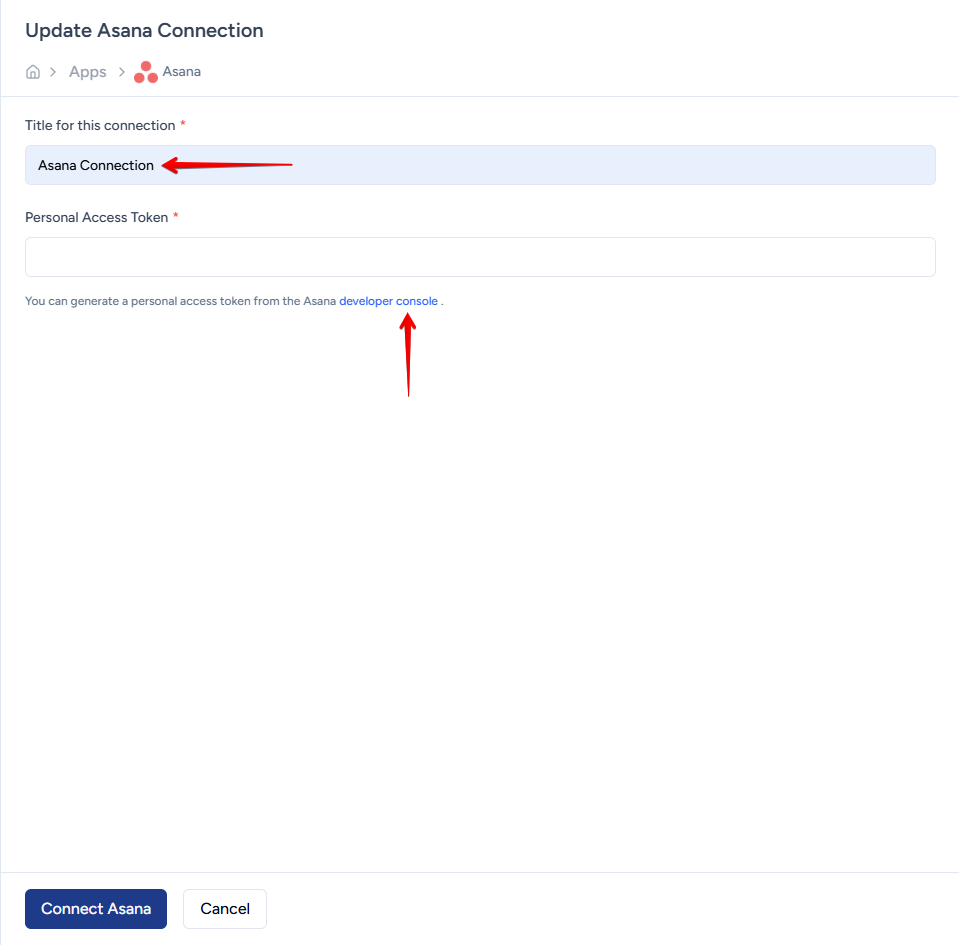 1. Now, add a title for your connection and enter your Personal Access Token. To generate the token, click on the “Developer Console” link in the field’s help text.