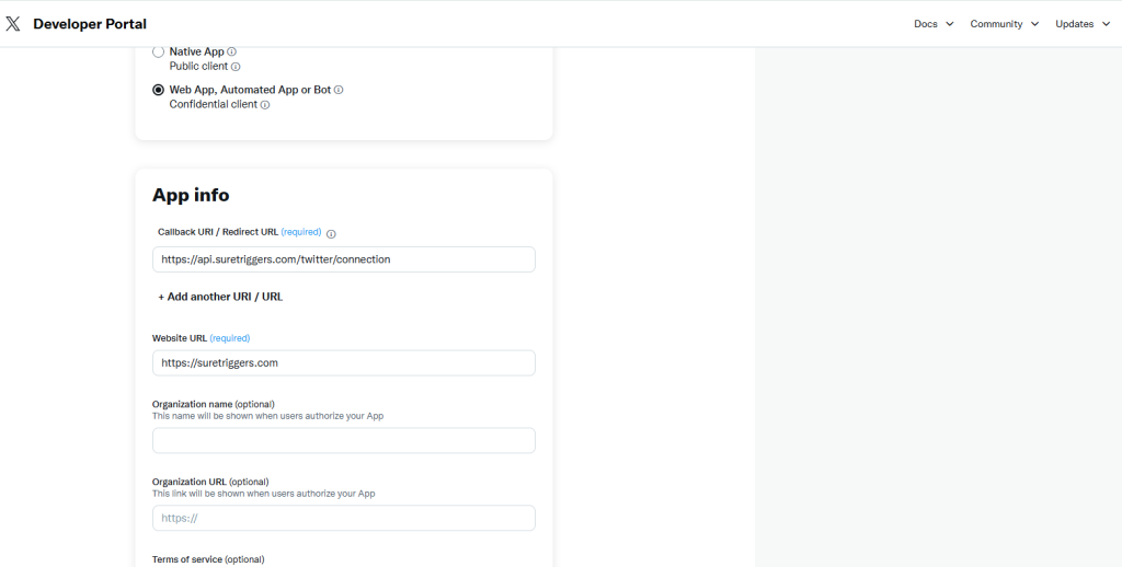- Callback URI / Redirect URL: https://api.suretriggers.com/twitter/connection