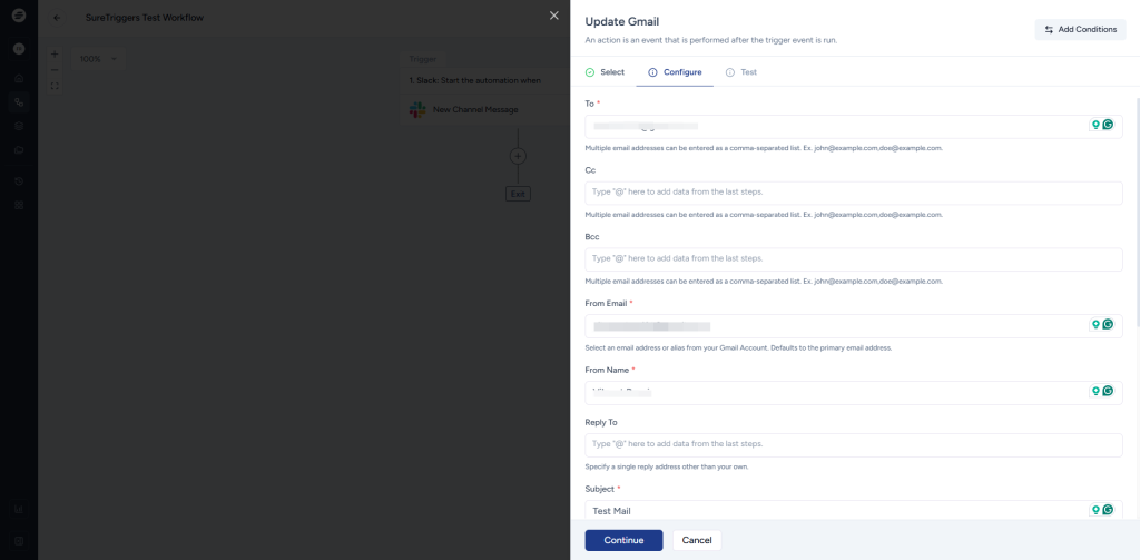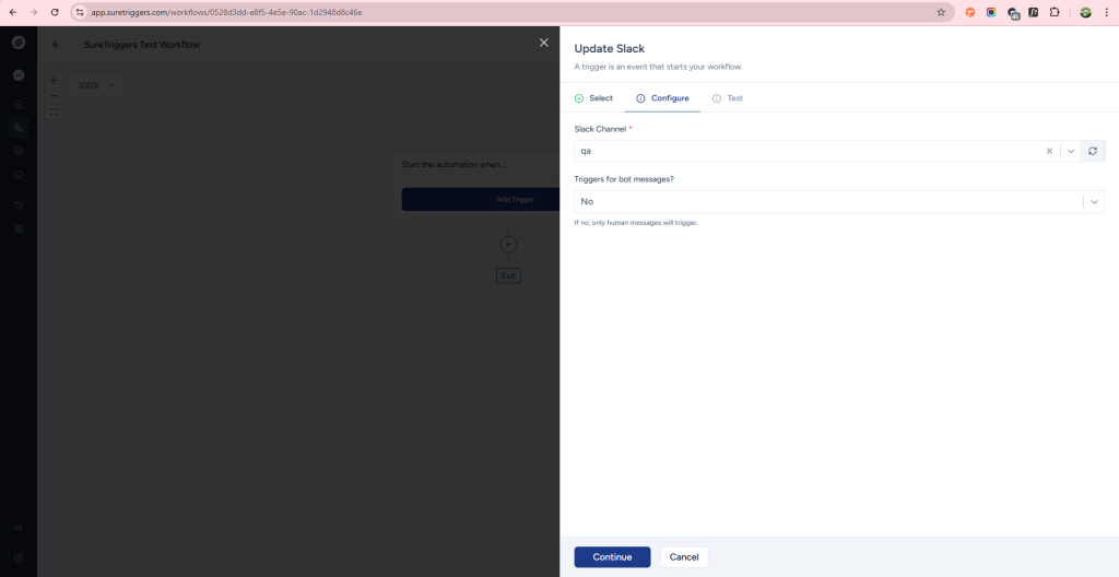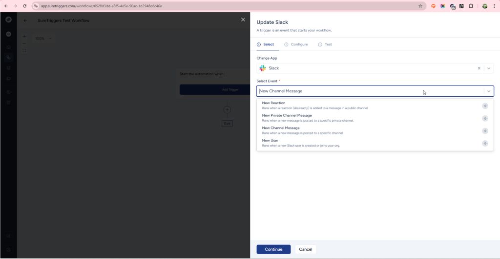 - Now, on the Configure tab, set up the trigger app (Slack) according to the instructions on the screen. The configuration may vary based on the selected app and event. Once you’re done with the configuration, click on the Continue button located at the end of the flyout to move to the next tab.