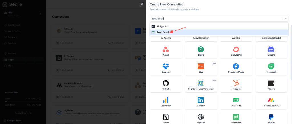 This guide will walk you through the process of creating a Send Email connection in OttoKit, enabling you to send automated emails through your preferred email provider.