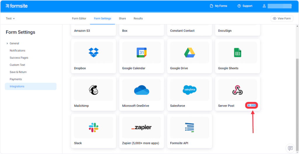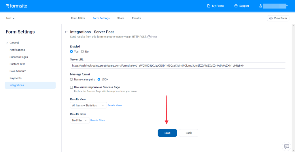 You can simply follow the steps below to add webhooks in Formsite settings: