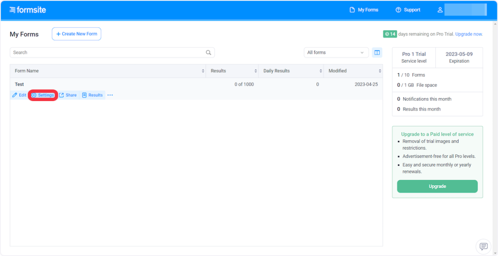 2. Select the form and click settings.