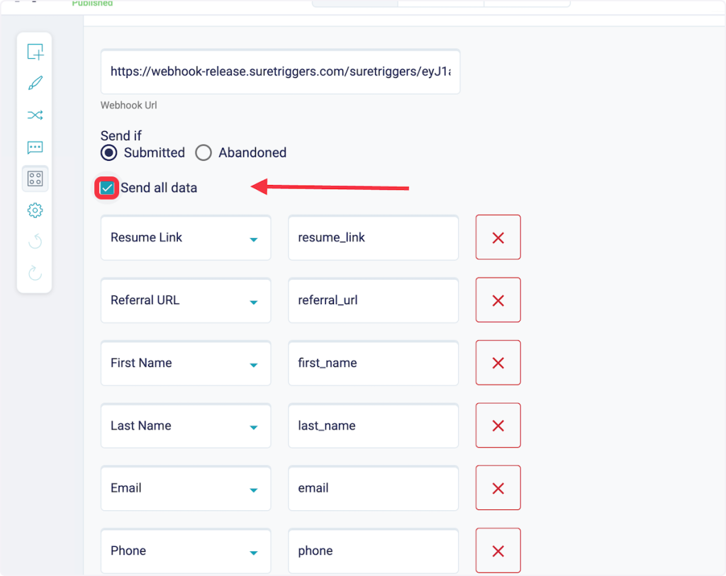 6. You can click Send all data to send all fields of the form or select the field-label pairs from the dropdown under Send all data checkbox.