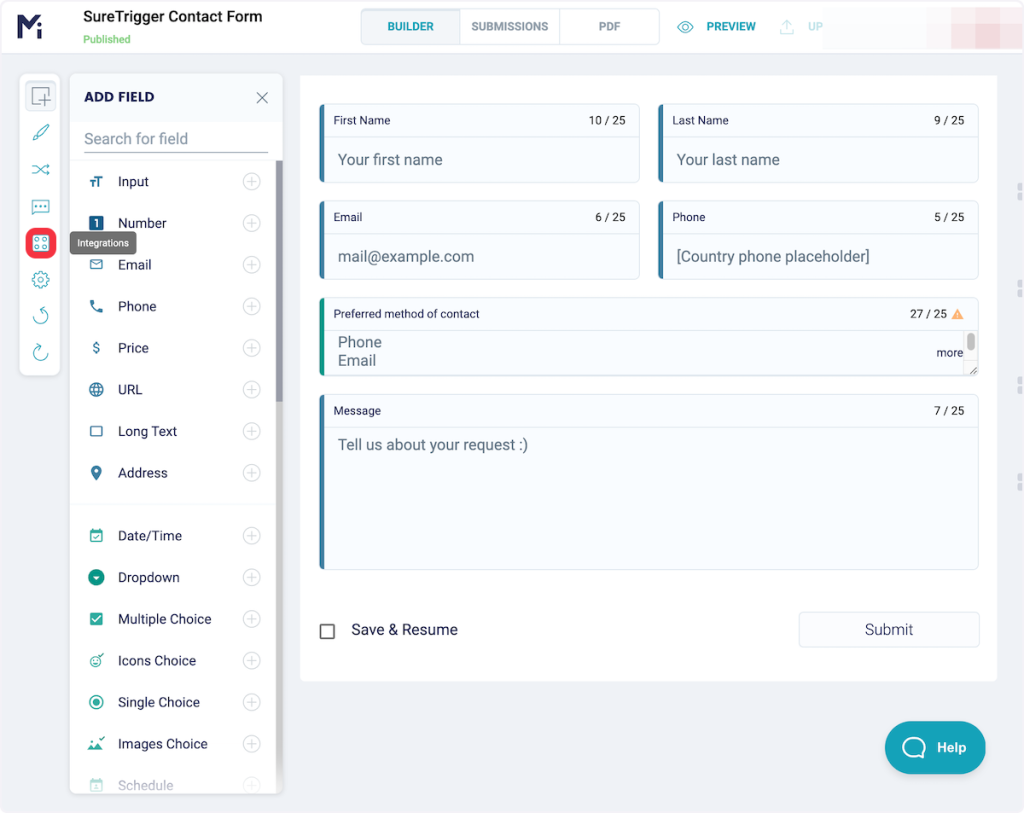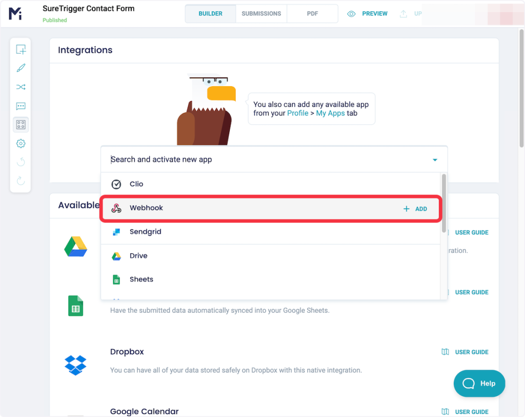 3. Once you’re at the form builder section, you can select Integrations settings, from the menu on the left side of the screen.