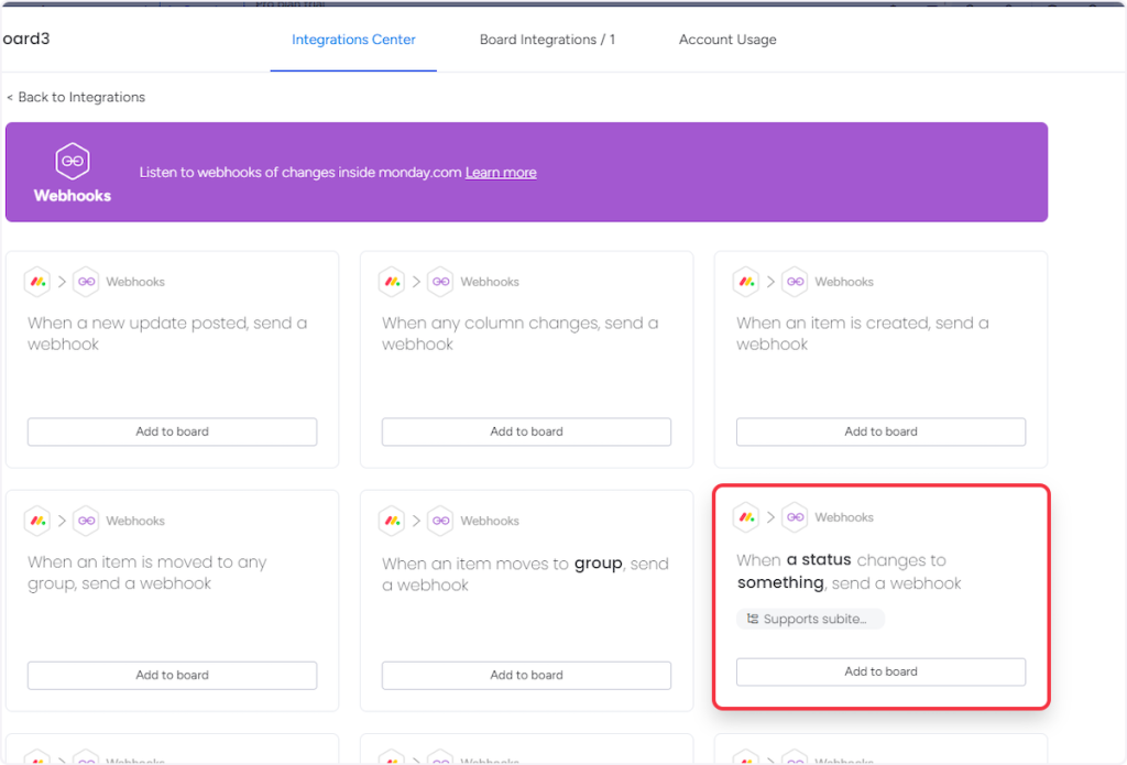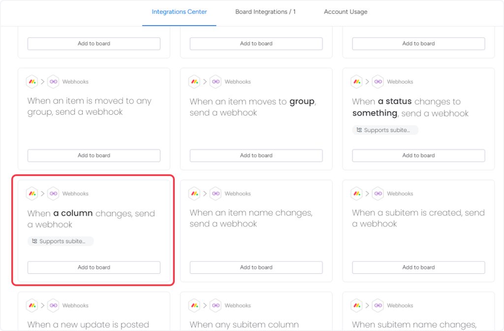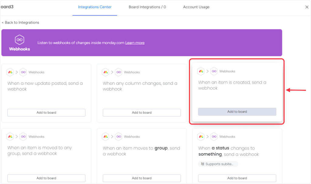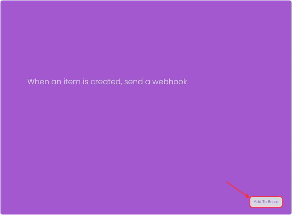 • 4. For Trigger “New Item in Board” – Choose the “When an item is created, send a webhook” option.