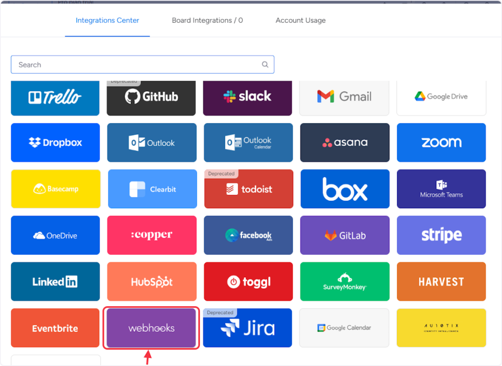 • 3. Search for the “Webhooks” in the “Integration Center” section.