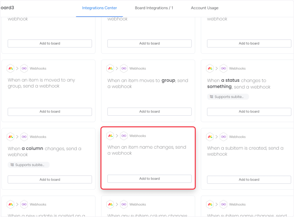 • 5. For Trigger “Item Name Changed” – Choose the “When an item name changes, send a webhook” option.
