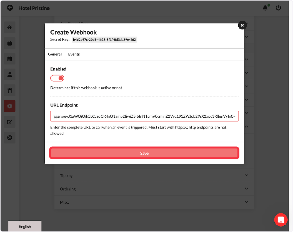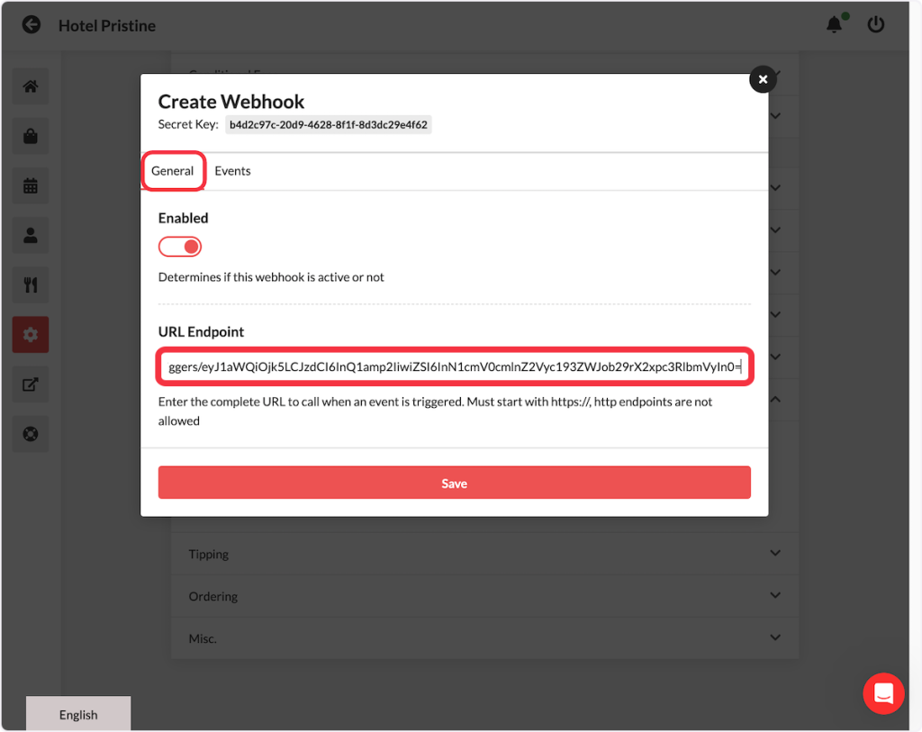 7. Now navigate to the General section and paste the Webhook URL under the URL Endpoint field.