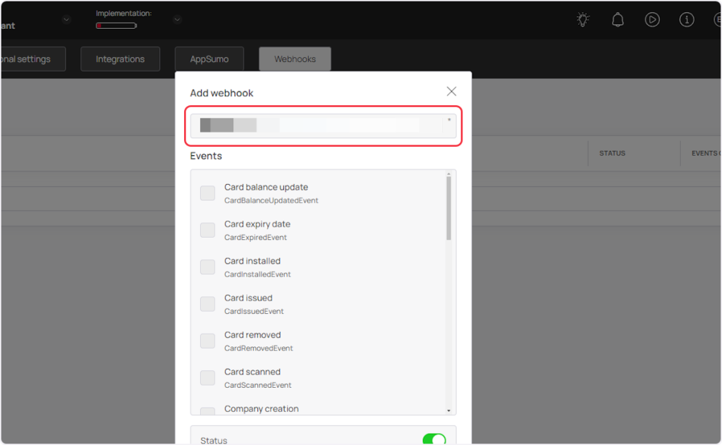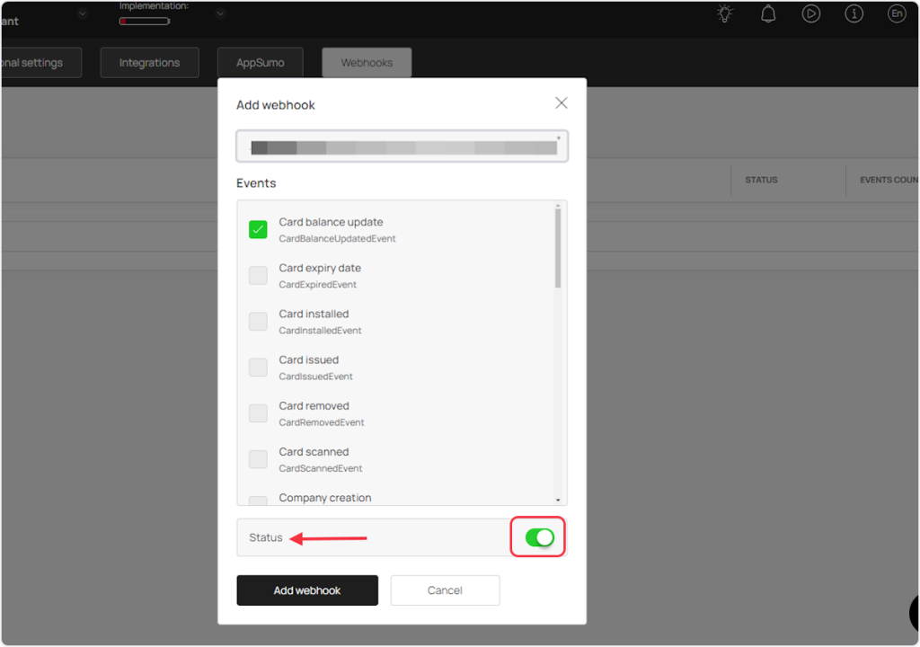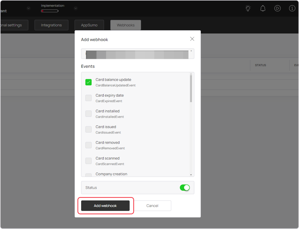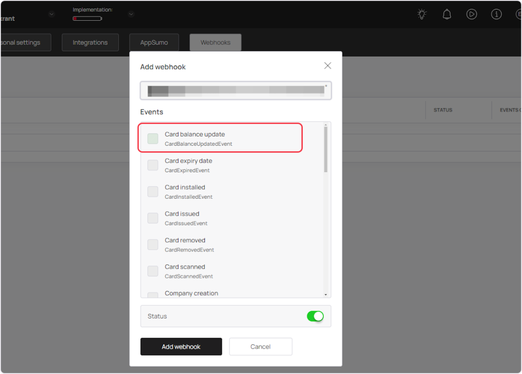 1. Now select the event from the ‘Events’ section according to your trigger. For example, if you are setting up a webhook for the “Card Balance Update” trigger, then you need to select the “Card balance update” event.