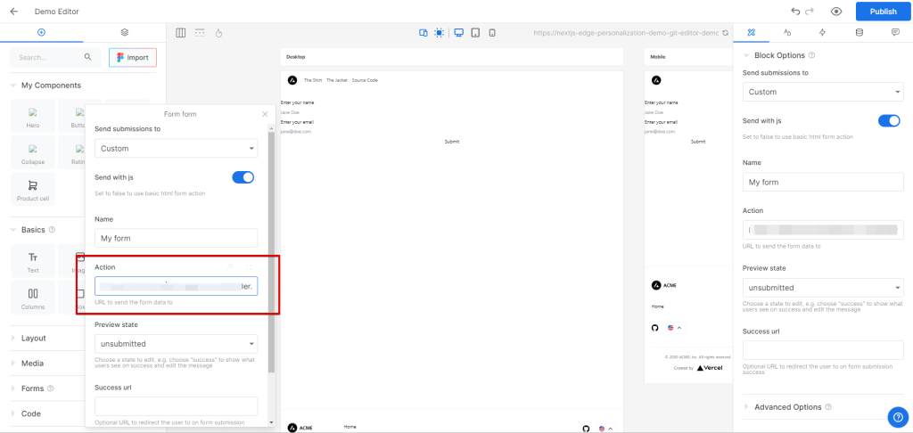 - Choose the “Custom” option in the “Send submissions to” field.