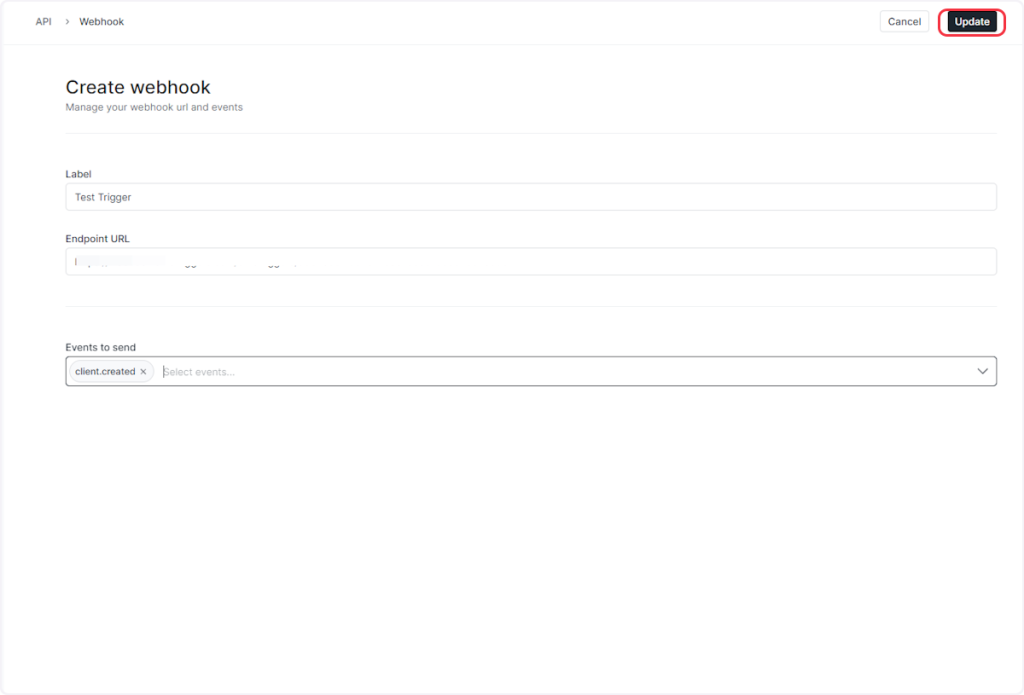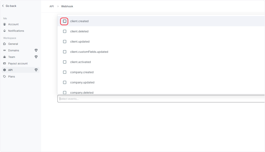 - Now check the event according to your trigger. For example, if you’re setting up a webhook for the “Client Created” trigger, then you need to select the “client.created” event here.