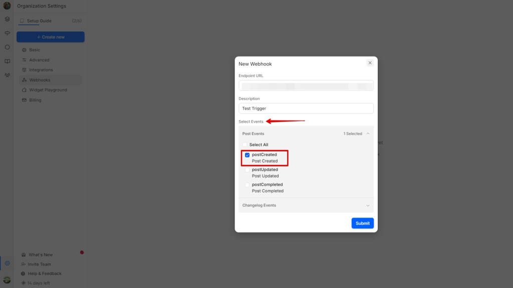 1. Now select events according to your trigger. For example, if you’re setting up a webhook for the ‘Post Created’ trigger, you need to select the ‘postCreated’ event under the ‘Post Events’ section.