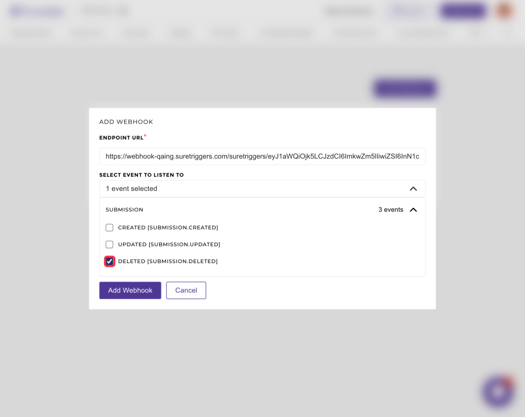 - Select the event CREATED [SUBMISSION.CREATED ] / UPDATED [SUBMISSION.UPDATED ] / DELETED [SUBMISSION.DELETED]