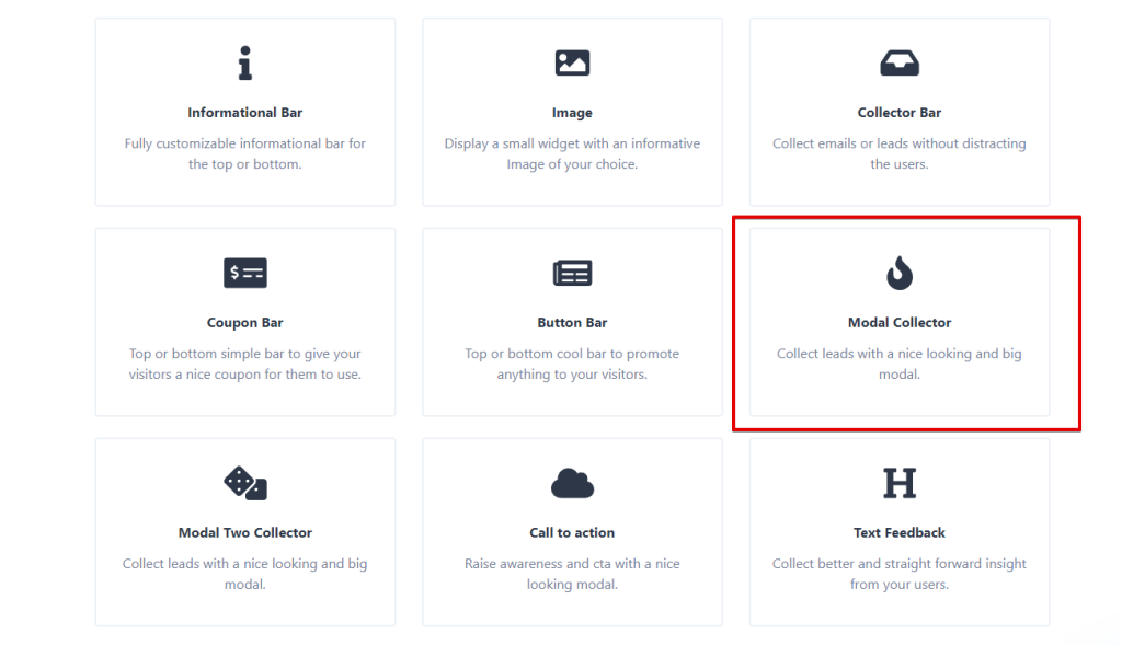 1. Select the type as “Modal Collector”, “Modal Two Collector”, “Email Counter”, “Countdown Collector”, or “Request Collector”.