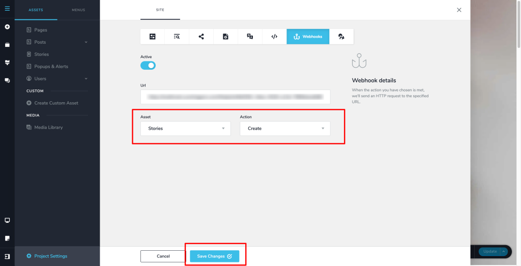 1. Now, select the ‘Asset’ and ‘Action’ based on your trigger. For example, if you are setting up a webhook for the “Popups & Alerts Created” trigger, you need to select “Popups & Alerts” as the asset and ‘Create’ as the action. Finally, click on the “Save Changes” button.