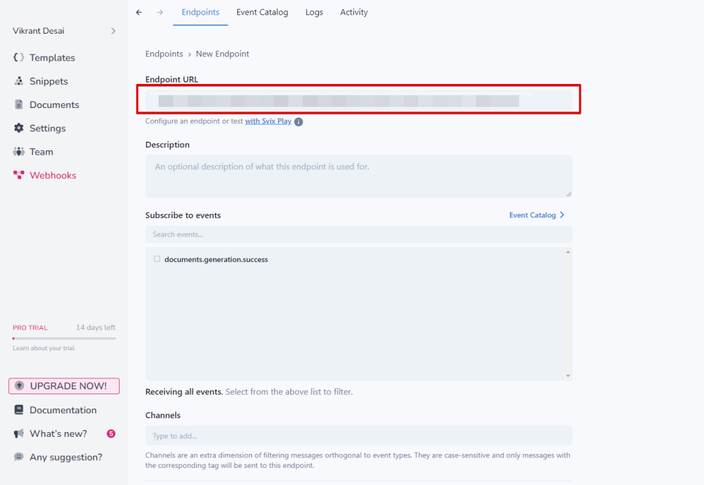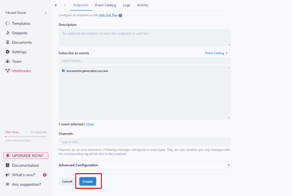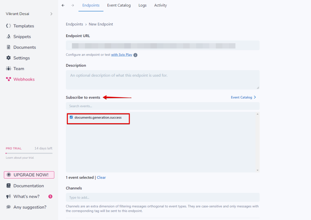 1. Check the “documents.generation.success” event from the “Subscribe to events” section.