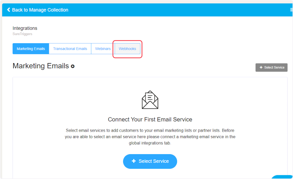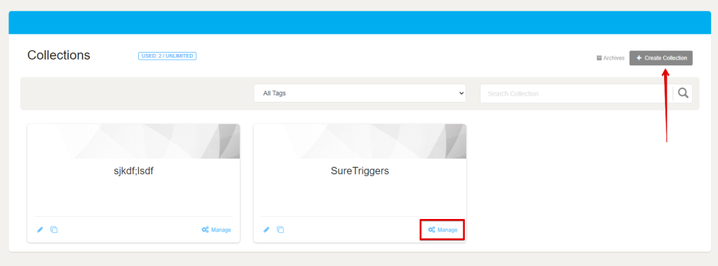 1. Now, click on the ‘Manage’ button of any created “Project/Collection”. If you haven’t created any projects or collections, then please create one to add a webhook.