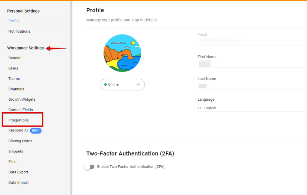 - Inside “Workspace Settings”, click on ‘Integrations’.