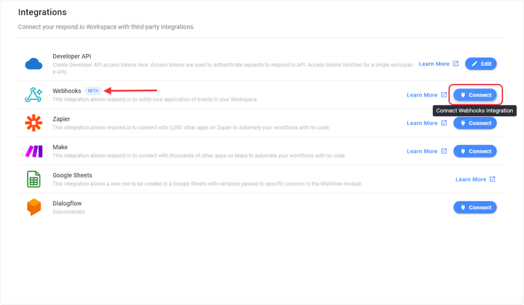 - Now on the ‘Integrations’ page, click on the ‘Connect’ button for the ‘Webhook’ integration.