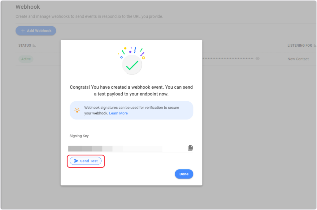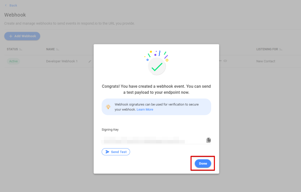 That’s it! You have successfully added a webhook to your Respond.io account.