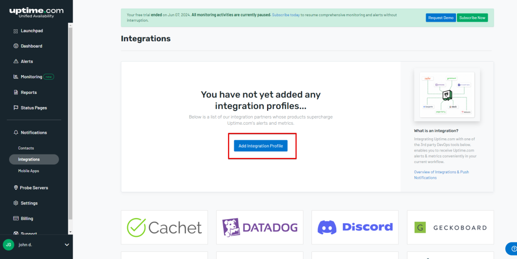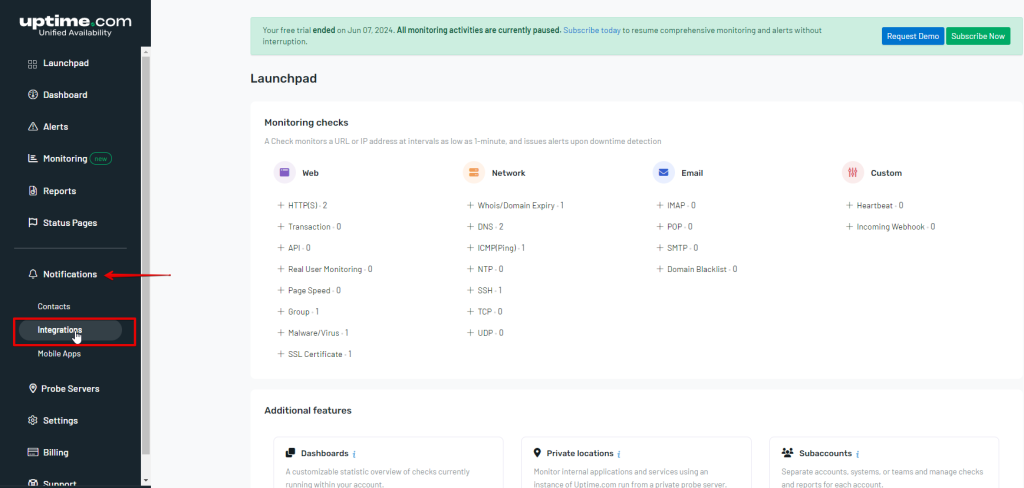 - On the sidebar, click on Notifications > Integrations.