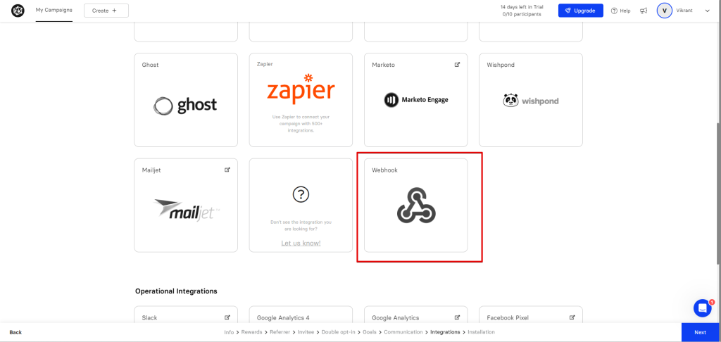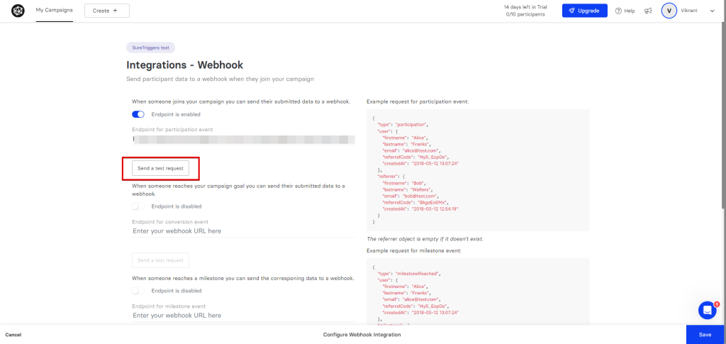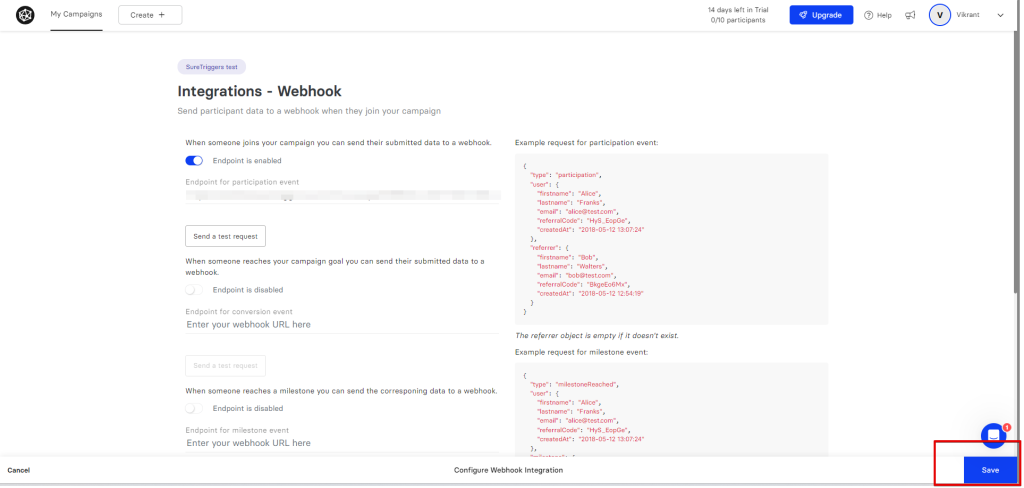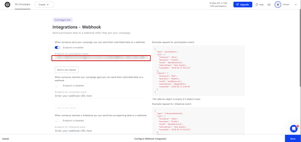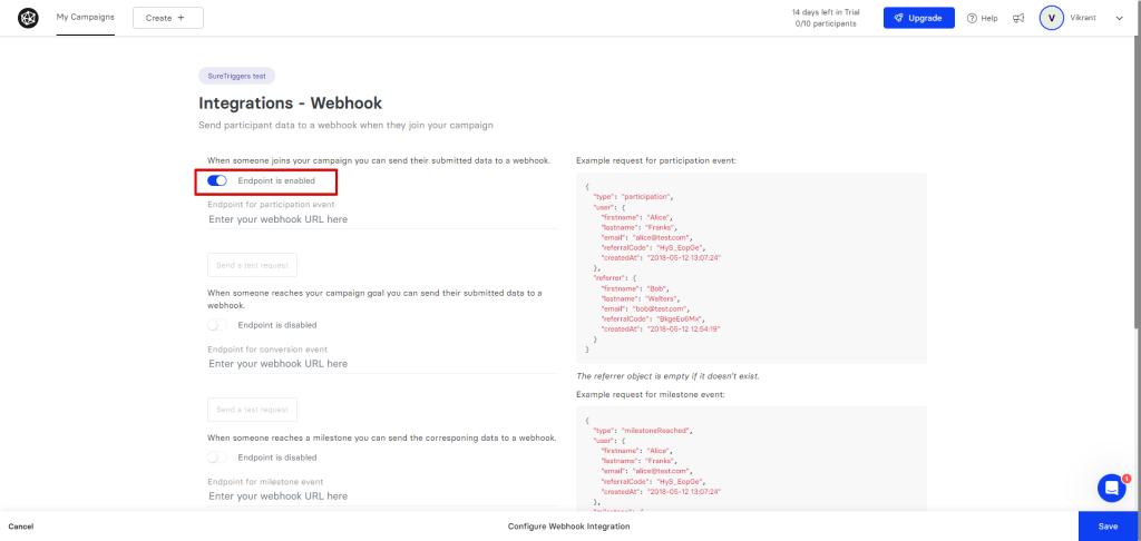 - Now, on the ‘Integrations – Webhook’ page, turn on the event according to your trigger. For example, if you’re setting up a webhook for the ‘New Participant’ trigger, you need to turn on the ‘When someone joins your campaign, you can send their submitted data to a webhook’ event.
