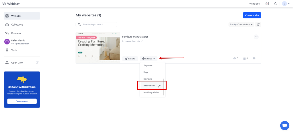 - In the site where you want to set up the webhook, go to Settings > Integrations.