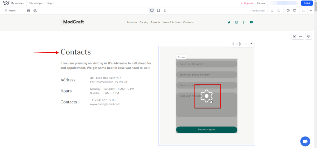- Now, click on the settings gear icon on the contact form in the site builder.