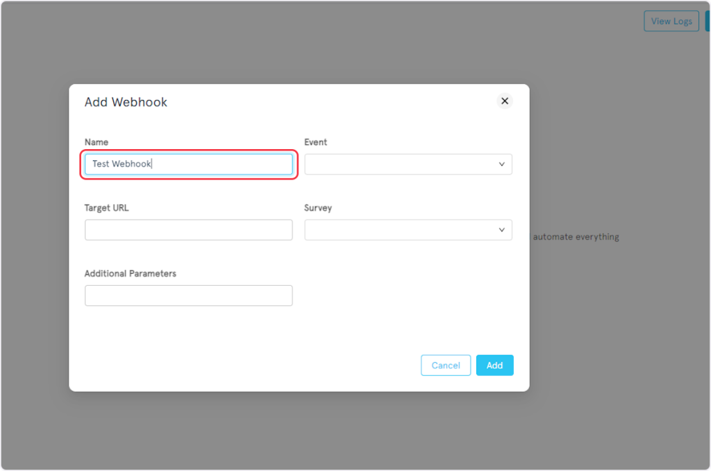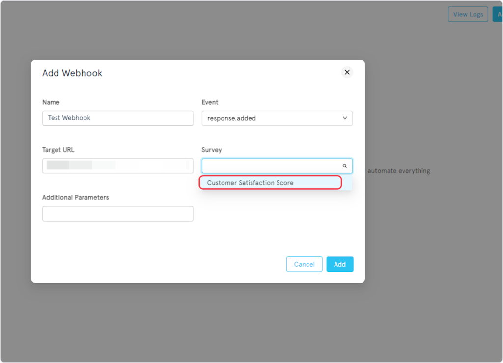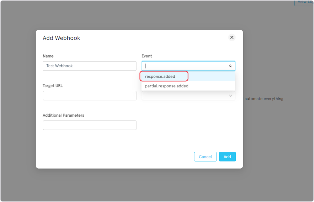 - Select the event according to your trigger. For example, if you’re setting up a webhook for the “Response Added” trigger, then you need to select the “response.added” event from the Event dropdown.