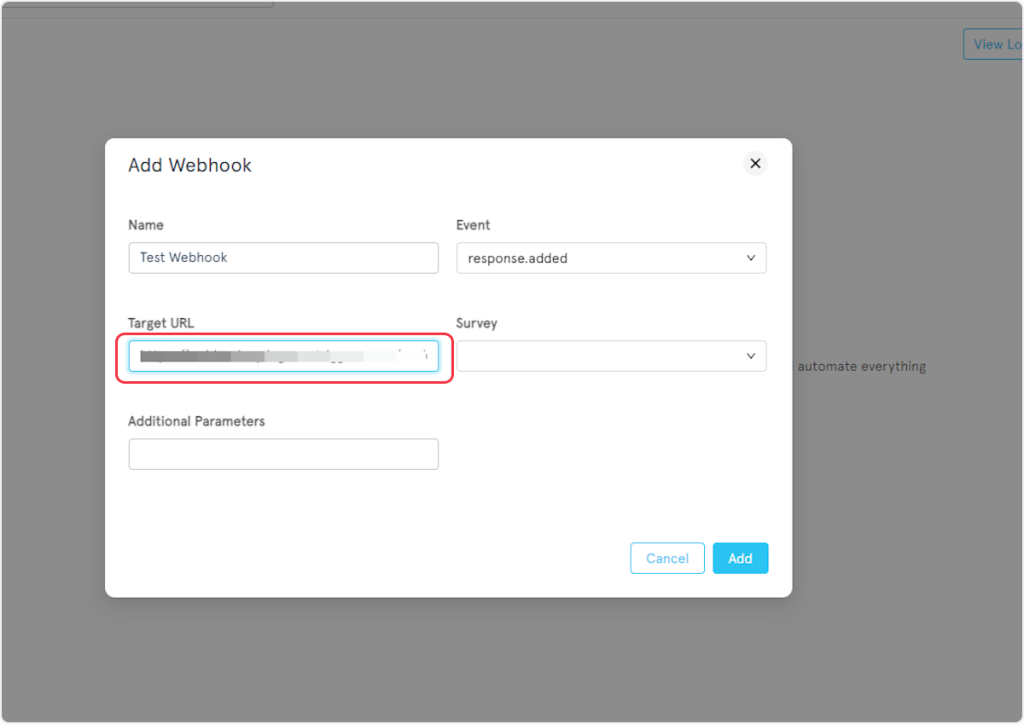 - Copy the Webhook URL from the trigger flyout and paste it into the “Target URL” field.
