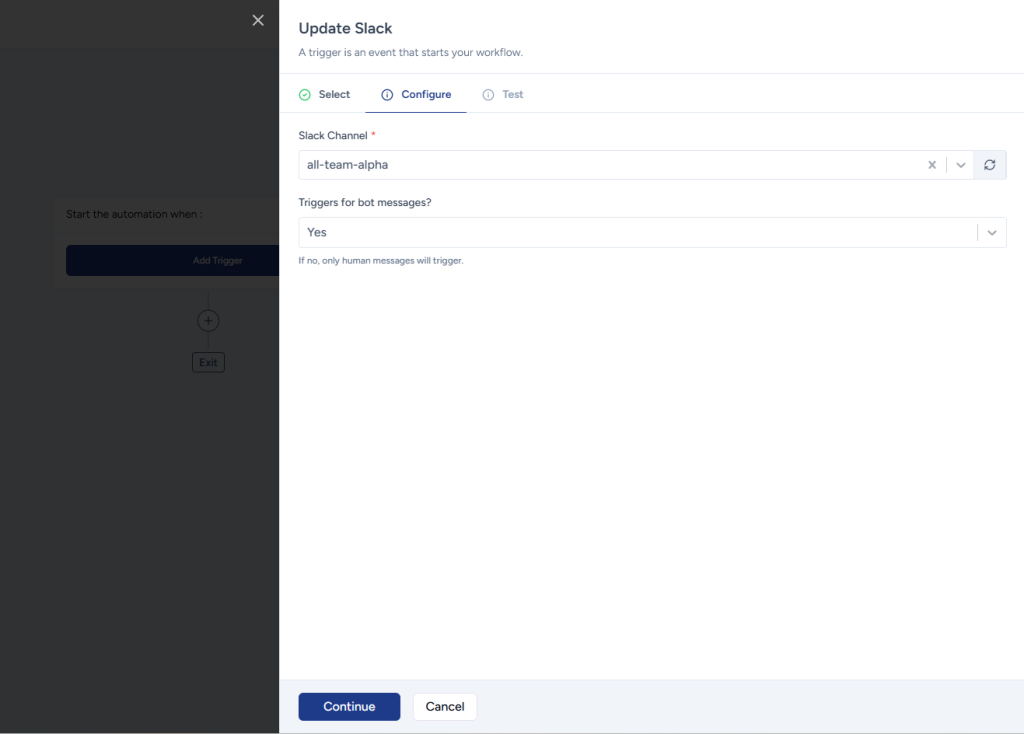 - Configure the trigger settings, such as channel, keyword, or specific conditions.