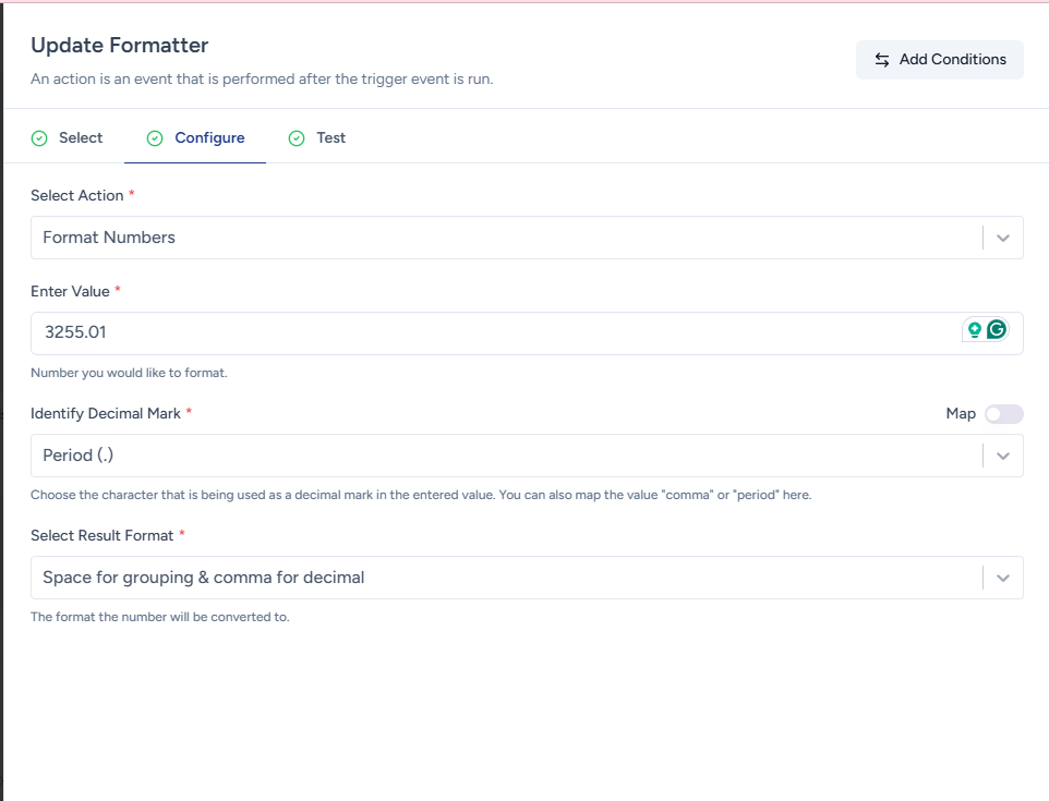 The Format Number action enables you to change the desired format of numbers by making changes to the decimal signs, and thousand separators if the number is not in your desired format.