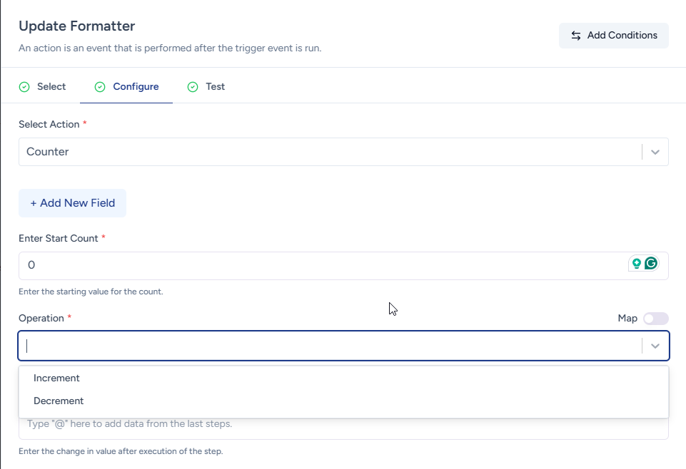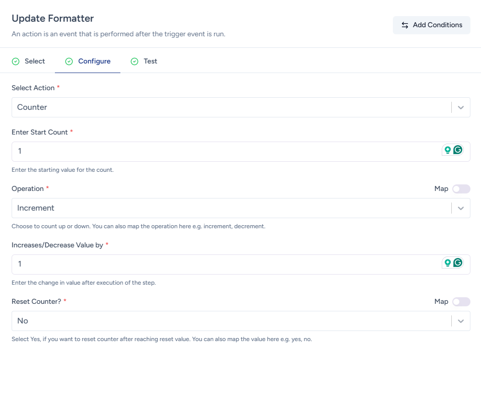 The Counter formatter action helps you generate numbers in a sequence every time your workflow runs.