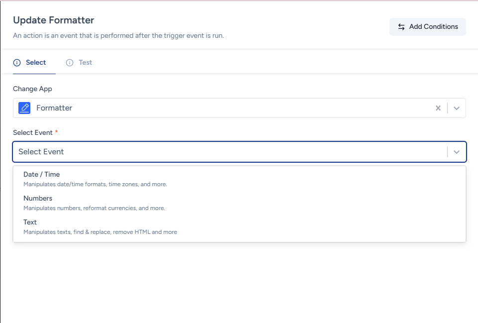 And select Numbers from the “Select Event” dropdown, once Numbers is selected, you can use any of the available actions to manipulate numeric values.