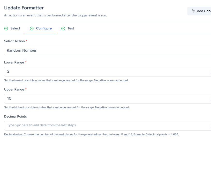 For example, if you have a workflow that involves selecting a random winner from a pool of participants, you can employ the Random Number formatter to generate a random number within the range of the participant count.