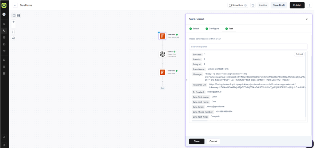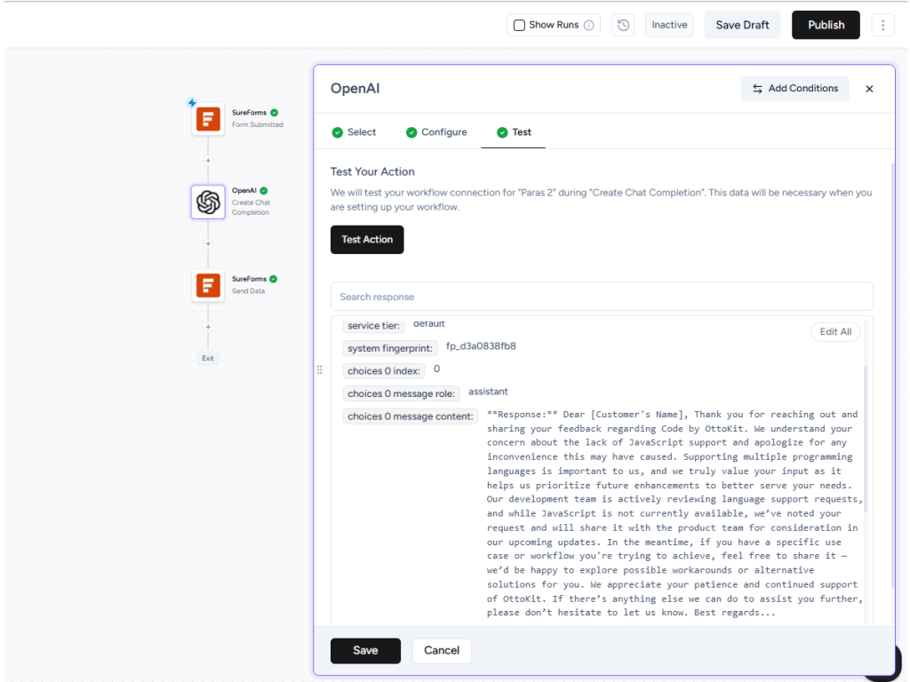 For example, whenever a visitor submits a SureForms form on your website, instead of just showing a generic confirmation, you can send their input to OpenAI to generate a personalized response.